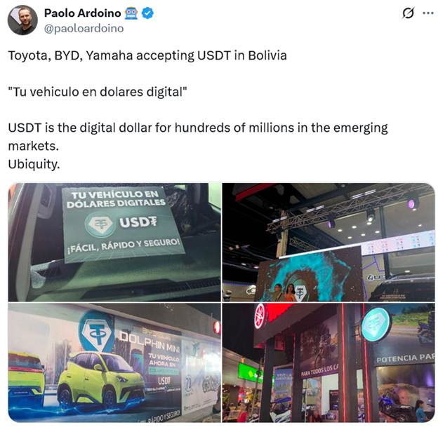 Hình ảnh được Ardoino chia sẻ cho thấy một đại lý xe hơi ở Bolivia đã treo biển quảng cáo USDT là phương thức thanh toán “dễ dàng, nhanh chóng và an toàn” cho việc mua xe. BitGo tiết lộ họ đã hợp tác với Tether và Toyota Bolivia để hỗ trợ cơ chế tự lưu ký (self-custody) và đảm bảo các giao dịch diễn ra suôn sẻ.